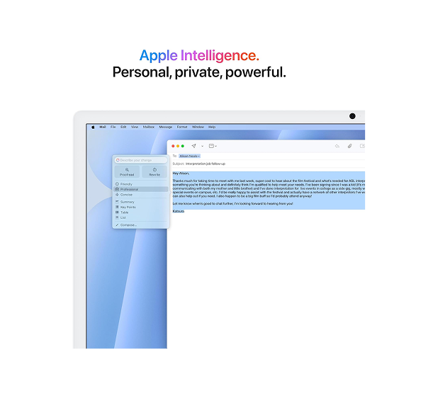 Built to work seamlessly with Apple Intelligence, it supports tools that help you write better, express ideas creatively, and complete tasks more efficiently. These features work privately and securely, giving you the confidence that your data stays protected and accessible only to you.