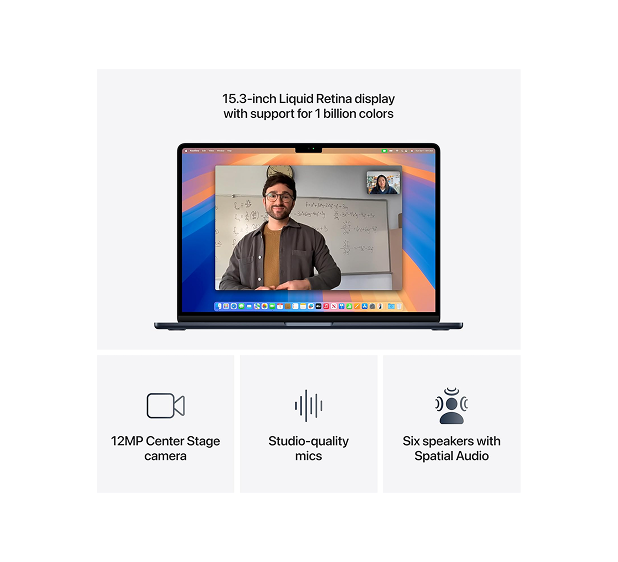 The device also elevates video calls and media with a 12MP Center Stage camera, a three-microphone setup, and a six-speaker audio system featuring Spatial Audio. Together, these features help you look and sound your best during meetings, recordings, or streaming.